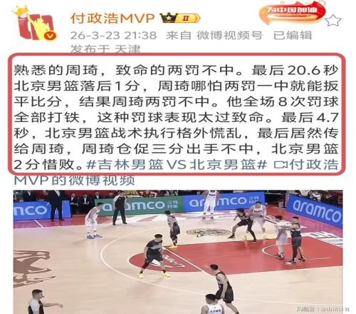 針對周琦在罰球線糟糕的表現(xiàn),著名媒體人付政浩賽后發(fā)文表示“熟悉的周琦,致命的兩罰不中。最后20.6秒北京男籃落后1分,周琦哪怕兩罰一中就能扳平比分,結(jié)果周琦兩罰不中。他全場8次罰球全部打鐵,這種罰球表現(xiàn)太過致命。最后4.7秒,北京男籃戰(zhàn)術(shù)執(zhí)行格外慌亂,最后居然傳給周琦,周琦倉促三分出手不中,北京男籃2分惜敗。”。