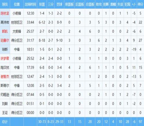 本場(chǎng)比賽,珀塞爾出場(chǎng)時(shí)間超過30分鐘,得到27分3籃板6助攻2搶斷。高詩巖找回進(jìn)攻感覺,貢獻(xiàn)22分3籃板5助攻3搶斷。陶漢林得到15分6籃板,是山東隊(duì)在場(chǎng)效果最好的球員,正負(fù)值為15。其他球員沒有人得分上雙。約翰遜狀態(tài)奇差,5投0中一分未得。瓊斯打了19分鐘,僅得到4分,正負(fù)值為-19。斯蒂爾7分5籃板,末節(jié)被棄用。廣廈隊(duì)外援塔克砍下36分15籃板12助攻的大號(hào)三雙。