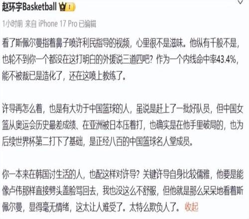 媒體人趙環(huán)宇也是直接發(fā)文開罵:看了斯佩爾曼指著鼻子噴許利民的視頻,心里很不是滋味,他縱有千般不是,也輪不到你一個都沒在這打明白的外援說三道四吧?作為一個內線命中率43.4%,能不被裁已是造化了,還在這噴上教練了。