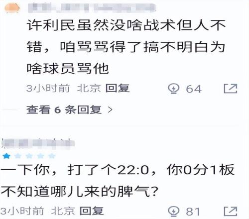 最近這段時間,北京隊戰(zhàn)績起伏比較大,北京球迷也是非常不滿教練許利民,但平心而論,北京戰(zhàn)績低迷的原因主要還是主力球員傷缺太多有關,許利民雖然執(zhí)教水平不算高,也經(jīng)常有抽象操作,但許指導在對待球員態(tài)度方面是沒得說的,比賽期間不罵人,不胡亂指責球員,輸球時候也很少甩鍋,是個談吐風雅的儒帥,就當時的比賽情況來看,許利民撤下斯佩爾曼完全沒問題。