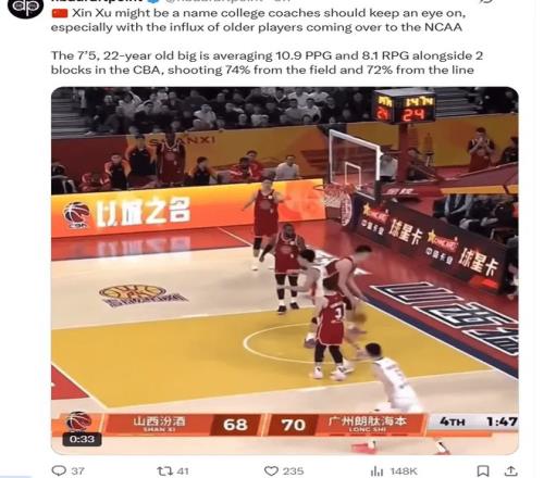 有美國媒體指出,有多所NCAA大學關(guān)注起了這位來自CBA的中鋒,稱贊徐昕有著不錯的敏捷性和天賦。