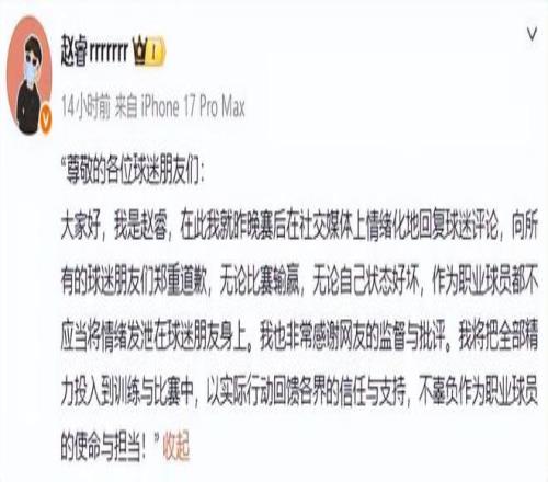 第二條消息來(lái)自于趙睿,2月2日晚間他在網(wǎng)上發(fā)出道歉信,對(duì)于輸給青島隊(duì)賽后回復(fù)網(wǎng)友的不理性言論道歉。