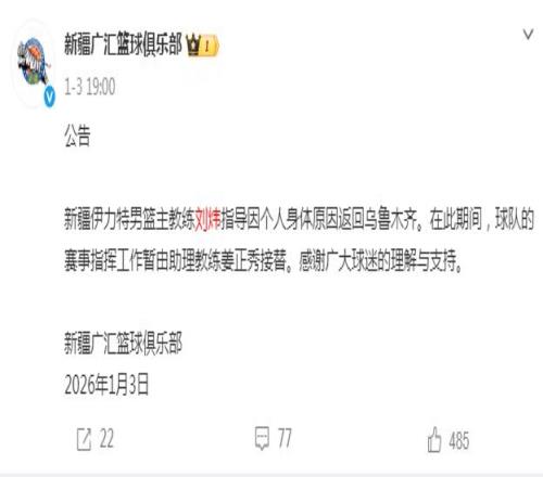 新疆伊力特男籃主教練劉煒指導(dǎo)因個人身體原因返回烏魯木齊。在此期間,球隊的賽事指揮工作暫由助理教練姜正秀接替,感謝廣大球迷的理解與支持。