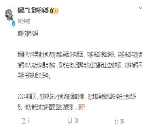 新疆伊力特男籃主教練劉煒指導(dǎo)因身體原因,向俱樂部提出辭職。經(jīng)俱樂部與劉煒指導(dǎo)本人充分溝通與協(xié)商,雙方在彼此理解與信任的基礎(chǔ)上達(dá)成共識,劉煒指導(dǎo)不再擔(dān)任球隊相關(guān)職務(wù)。