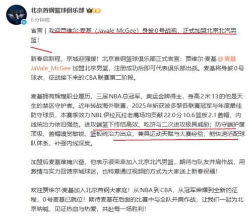 周琦迎來(lái)爭(zhēng)冠好幫手!北京隊(duì)正式宣布:簽約三屆NBA總冠軍,奧運(yùn)會(huì)金牌得主,2米13內(nèi)線悍將賈維爾·麥基!剛剛,北京隊(duì)宣...