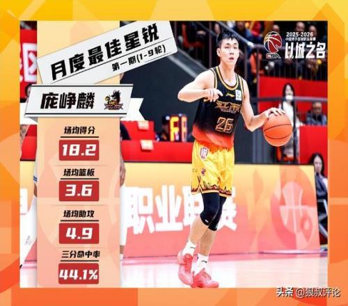 在常規(guī)賽10-23輪的比賽中,龐崢麟出戰(zhàn)14場(chǎng)。在他場(chǎng)均出場(chǎng)的32分鐘里,能夠得到15分、2.8籃板、5.8助攻的數(shù)據(jù),罰籃命中率82.3%。龐崢麟在本月度4次得到20+的單場(chǎng)得分,其中包含一場(chǎng)26分、8籃板、13助攻的“準(zhǔn)三雙”數(shù)據(jù)。