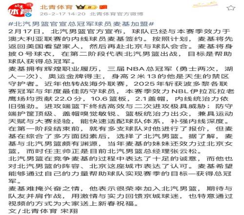 北京首鋼俱樂部官宣麥基加盟,麥基第二階段就可以上場,將穿0號球衣。京媒【北青體育】詳細報道了北京首鋼得到...
