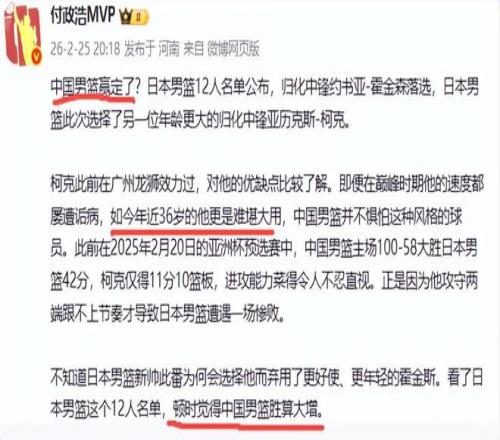 而柯克在2025年2月的亞洲杯預(yù)選賽日本男籃58-100慘敗給中國(guó)男籃的比賽中表現(xiàn)低迷,只得到11分10籃板。事實(shí)上柯克原來(lái)在廣州隊(duì)效力過(guò),現(xiàn)在已36歲。付政浩 之所以這么樂觀,認(rèn)為日本隊(duì)主教練用柯克取代霍金斯是一個(gè)昏招,他表示柯克又老又慢,有用人唯親的嫌疑。