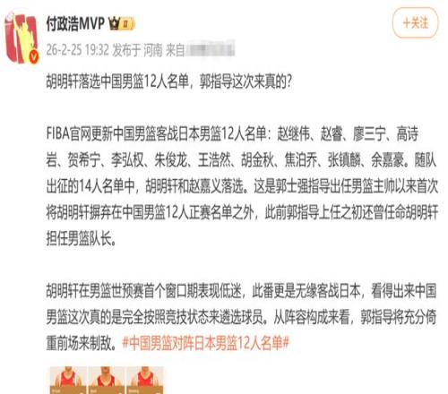 因為胡明軒在男籃世預賽首個窗口期表現(xiàn)不佳,本賽季整體狀態(tài)也不夠理想。