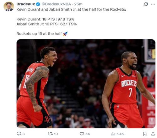 37歲的凱文-杜蘭特掃去了上一場16中7的陰霾,首節(jié)4中4拿到9分3助攻2籃板1蓋帽效率極高。小賈則三分2中2拿到8分1籃板,火箭球迷親切的稱這兩人為“真假杜蘭特”,他們幫助火箭大比分領先爵士。