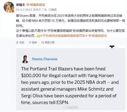 4月2日,楊瀚森再度登上熱搜,但原因并非賽場(chǎng)表現(xiàn),而是開拓者隊(duì)被NBA聯(lián)盟處以10萬(wàn)美元罰款。據(jù)名記Shams報(bào)道,開拓者在2022年選秀前,與尚未進(jìn)入NBA的楊瀚森存在非法接觸,其助理總經(jīng)理邁克斯密茨與奧利瓦亦被停薪停職兩周。開拓者已公開接受處罰,聲明“全力配合調(diào)查”,并放棄上訴。
