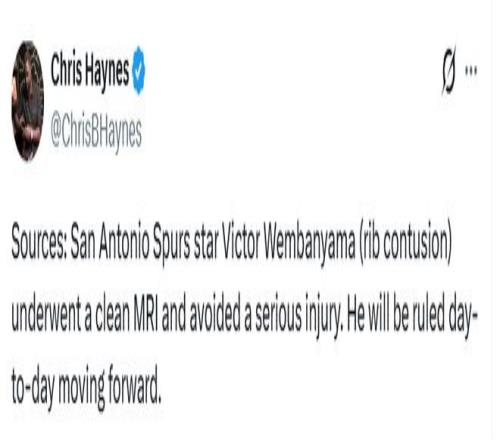 北京時(shí)間4月8日,據(jù)名記Shams報(bào)道,馬刺方面并不認(rèn)為文班亞馬遭遇嚴(yán)重傷病。文班亞馬昨晚對(duì)肋骨部位拍了X光,結(jié)果...