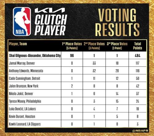 另外,從目前曝光的MVP投票數(shù)據(jù)來看,亞歷山大也是大概率能斬獲常規(guī)賽MVP的獎(jiǎng)項(xiàng)。