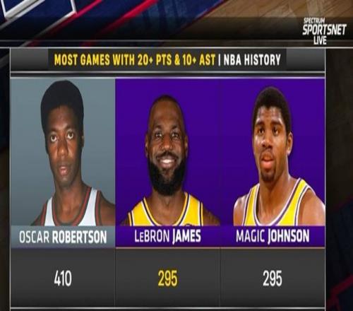 第三,歷史20分10助場(chǎng)次榜:大O以410場(chǎng)排名第一,詹姆斯295場(chǎng)與魔術(shù)師并列第2。