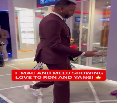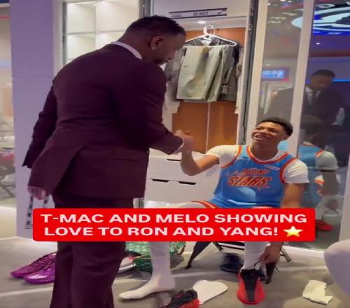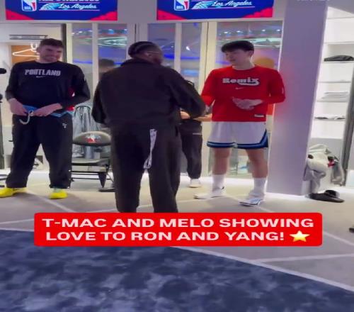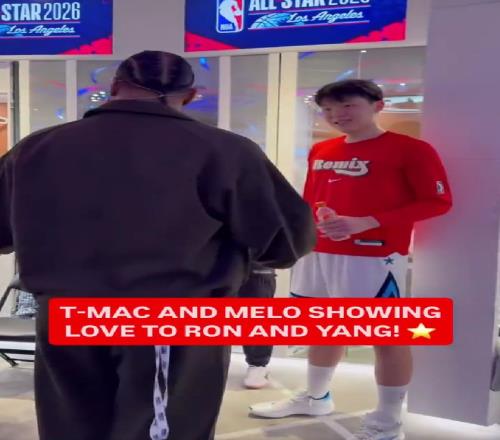 在比賽之前,麥迪、安東尼等NBA傳奇球星來到了新秀更衣室,和聯(lián)盟最炙手可熱的新人們打招呼,一身酒紅西裝的麥迪也主動來到了更衣室,和楊瀚森打招呼。