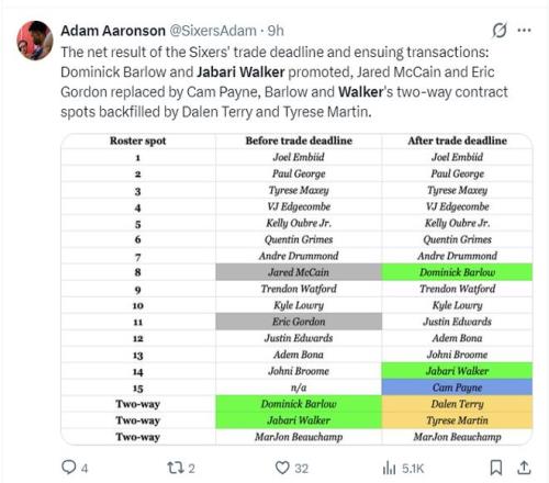 費城全新15人名單:馬克西、恩比德、喬治、埃奇庫姆、烏布雷、德拉蒙德、洛瑞、愛德華茲、格蘭姆斯、博納、比徹姆、沃特福德、布魯姆、鮑德溫、巴錫。