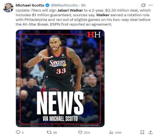 根據(jù)邁克爾-斯科特的報道,費城76人與賈巴里-沃克簽下的是一份兩年335萬的合同,而這兩年合同僅保障100萬美元。費城在全明星周末前就已經(jīng)為沃克預(yù)留了輪換位置,當(dāng)他雙向合同日期截止后立馬為其辦理了轉(zhuǎn)正。
