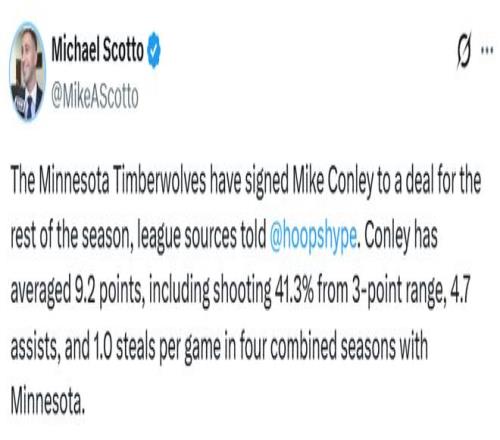 北京時間2月18日,控球后衛(wèi)邁克-康利已經(jīng)與森林狼隊重新簽約。這筆交易已出現(xiàn)在NBA官網(wǎng)的官方運作日志中,Hoops...