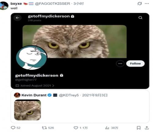 除此之外,杜蘭特的大號將這個小號拉黑了,而這個他不認(rèn)識的疑似小號也將他拉黑了,所以他確定這個賬號就是屬于杜蘭特。并且,該賬號的資料背景圖片,也曾在杜蘭特的大號里出現(xiàn)過(下圖的貓頭鷹):