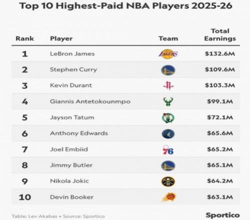 北京時(shí)間2月21日,美媒Sportico公布2025-26賽季NBA總收入(NBA年薪+場(chǎng)外代言收入)最高前十球員榜單,詹姆斯以1.326...