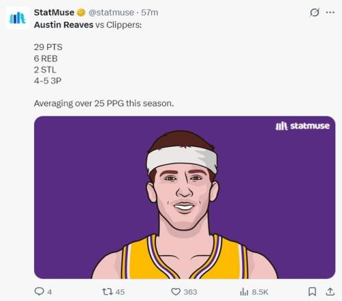 里夫斯全場(chǎng)比賽33分鐘,15中9,三分5中4,罰球7中7,拿到29分6籃板2助攻2搶斷3失誤,命中率60%,三分命中率80%,罰球命中率100%,真實(shí)命中率70.2%,此役湖人三巨頭就里夫斯的效率值最高。