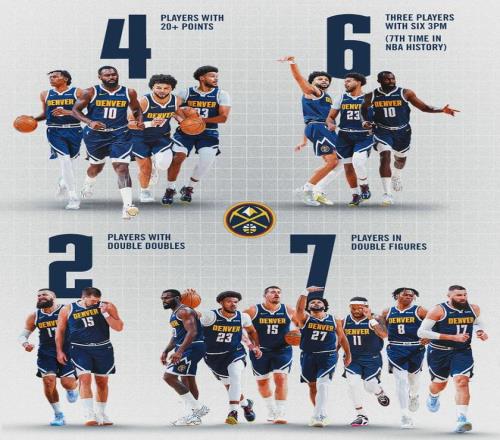 掘金兩個首發(fā)缺陣:阿隆-戈登和佩頓-沃特森都沒打。本賽季掘金場均120.9分,高居聯(lián)盟第一;進攻效率123.8,同樣是聯(lián)盟第一;投籃命中率49.6%,聯(lián)盟第二;三分命中率39.6%,聯(lián)盟第一;場均罰球命中數(shù)21.1,聯(lián)盟第二。