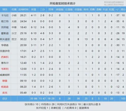 此役阿夫迪亞投籃10中5,三分4中0,罰球7中5,得到15分8籃板13助攻6失誤,正負值-30。約基奇打了29分鐘,投籃15中10,三分4中3,罰球11中9,狂砍32分9籃板7助攻4搶斷,正負值+40。其中正負值追平約老師生涯紀錄!