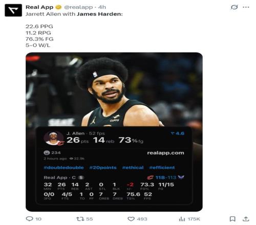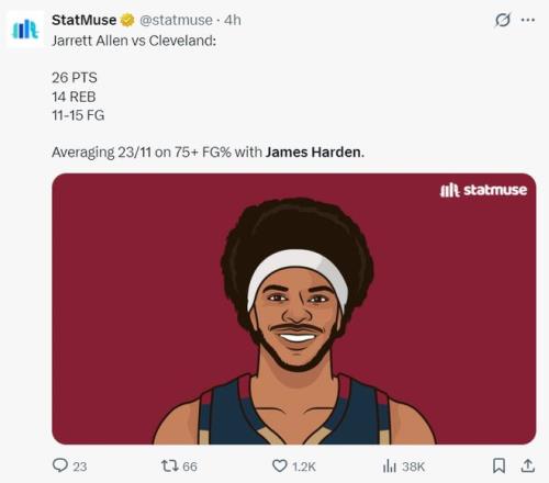 在哈登加盟騎士后,賈萊特-阿倫是最受益的那個(gè),他場均拿到22.6分11.2籃板,真實(shí)命中率76.3%。