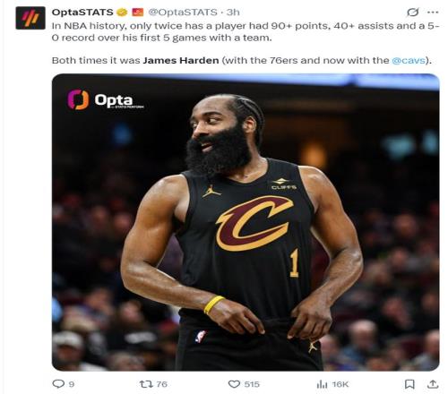 根據(jù)數(shù)據(jù)媒體的統(tǒng)計(jì),一名球員換隊(duì)后的前五場比賽,能得到90分以上、助攻數(shù)超過40次以上且球隊(duì)?wèi)?zhàn)績5勝0負(fù)的球員只有詹姆斯-哈登,NBA歷史上出現(xiàn)了兩次都是哈登,上一次是出現(xiàn)在費(fèi)城76人。