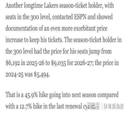 還有鐵桿球迷,那可是持有300區(qū)域季票的老江湖了。他給ESPN提供了票據(jù)記錄,這一看,好家伙,那漲幅簡(jiǎn)直能把人嚇暈過(guò)去!2025 - 26賽季,他這季票價(jià)格是6192美元,到了2026 - 27賽季,直接飆升到9035美元!要知道,2024 - 25賽季才5494美元呢。這意味著下賽季漲幅高達(dá)45.9%,而上一次續(xù)費(fèi)周期的漲幅才12.7%,這差距,就像坐電梯和爬樓梯一樣,一個(gè)快得嚇人,一個(gè)慢得要命。