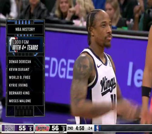 德羅贊在4支球隊(duì)達(dá)成命中1000記運(yùn)動(dòng)戰(zhàn)進(jìn)球里程碑,成為NBA歷史第6人,前5人分別是杜蘭特、弗里、歐文、伯納德-金與摩西-馬龍。