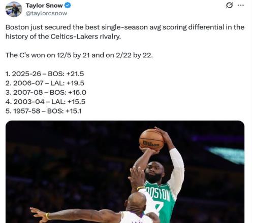 湖人隊(duì)不僅被凱爾特人隊(duì)常規(guī)賽雙殺橫掃, 兩場(chǎng)還一共輸?shù)?3分之多,場(chǎng)均凈輸21.5分創(chuàng)造凱湖單賽季場(chǎng)均勝分差新高。