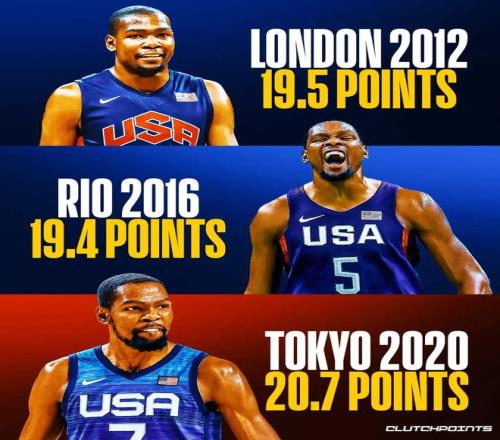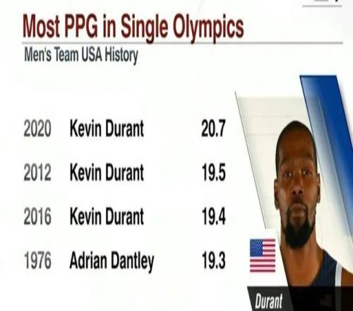 值得注意的是,美國(guó)男籃奧運(yùn)歷史上,單屆場(chǎng)均得分前三的都是杜蘭特(分別就是杜蘭特的前三次奧運(yùn)會(huì)之旅),他的得分能力有多么突出足以見得。