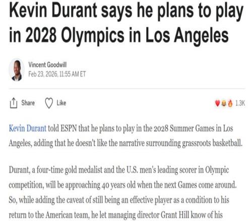 作為四屆奧運(yùn)金牌得主,也是美國男籃奧運(yùn)歷史得分王,杜蘭特2028年奧運(yùn)會時將接近40歲。
