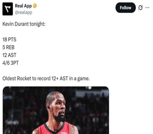 值得一提的是,12次助攻不僅是杜蘭特火箭生涯新高,37歲147天的杜蘭特也成為火箭隊(duì)史單場送出至少12次助攻年齡最大的球員。