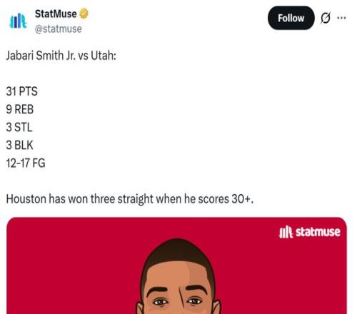 對于嚴(yán)重缺乏投射威脅的火箭隊(duì)來說,小賈已經(jīng)成為球隊(duì)贏球風(fēng)向標(biāo),本賽季當(dāng)他拿下30+得分表現(xiàn)時火箭隊(duì)3勝0負(fù)保持不敗。