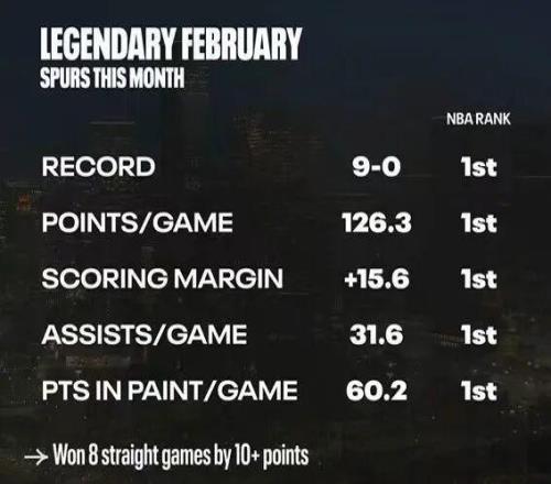 馬刺當前勢頭極佳,今年二月份至今未嘗敗績,9勝0負,并且場均得分(126.3)、場均凈勝分(15.6)、場均助攻數(shù)(31.6)、場均禁區(qū)得分(60.2)均高居聯(lián)盟榜首,對于他們而言一切皆有可能。