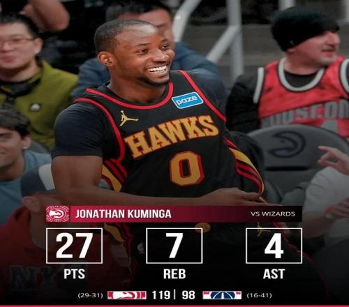 迎來老鷹生涯首秀的庫明加表現(xiàn)十分搶眼,替補(bǔ)出戰(zhàn)約24分鐘,投籃12中9,其中三分4中3,罰球7中6無比高效砍下27分外加7板4助2斷全面數(shù)據(jù),正負(fù)值+16,幫助新東家119-98輕松擊敗奇才。