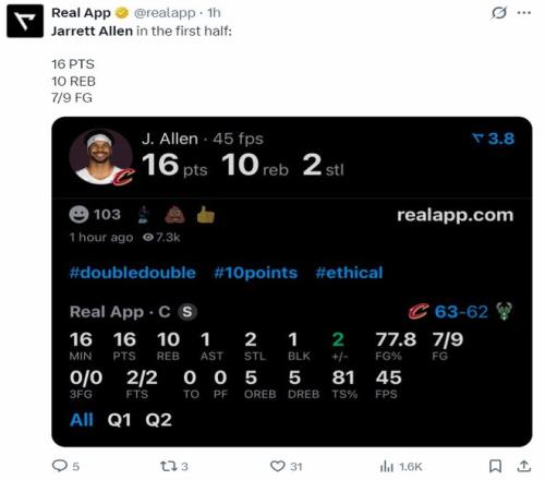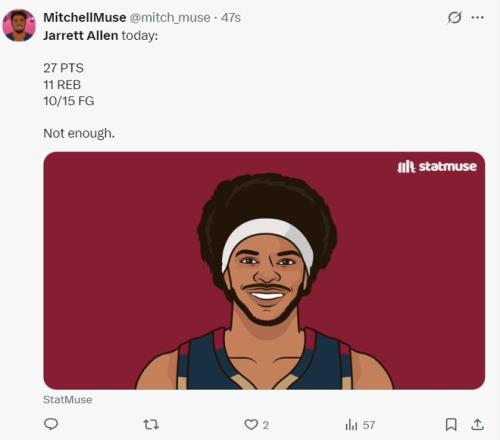 這導(dǎo)致整個下半場阿倫只有1個籃板球進(jìn)賬,全場比賽32分鐘,15中10,罰球8中7,拿到27分11籃板1助攻2搶斷1蓋帽,命中率66.7%,真實(shí)命中率72.9%,正負(fù)值-10。雖然沒有騎士三巨頭阿倫依舊拿到了爆炸的兩雙數(shù)據(jù)。