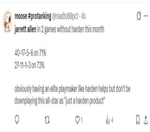 有數(shù)據(jù)媒體寫道,二月份阿倫在沒有哈登的情況下打了兩場比賽,一場40分17籃板5助攻2搶斷4蓋帽,真實(shí)命中率71%;一場27分11籃板1助攻2搶斷1蓋帽,真實(shí)命中率73%,這兩場比賽合計(jì)拿到67分28籃板,顯然擁有哈登這樣的組織核心對阿倫有所幫助,但不要將阿倫這位全明星內(nèi)線貶低為“僅僅是哈登幫助的產(chǎn)物”。