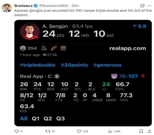 休媒曬出申京此役的數(shù)據(jù),盛贊此役他拿到了怪物一般的三雙數(shù)據(jù)。本賽季申京場(chǎng)均6.3助攻實(shí)際是火箭的第一組織進(jìn)攻點(diǎn),他繼續(xù)朝著約基奇的方向進(jìn)發(fā)。