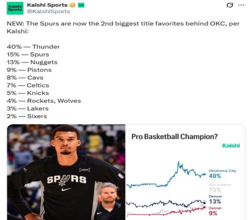 在常規(guī)賽進入沖刺階段,預(yù)測平臺Kalshi Sports更新NBA本季奪冠概率,其中火箭4%并列第八,湖人3%勇士落選,榜首40%...