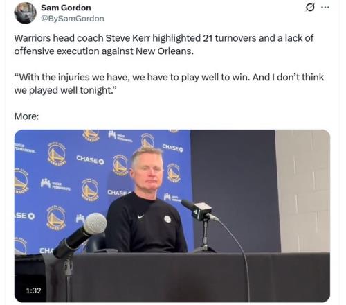 科爾還專門指出失誤與執(zhí)行力問題,強(qiáng)調(diào)球隊(duì)全場(chǎng)出現(xiàn)21次失誤太多,也正如科爾所說,由于傷病問題過于嚴(yán)重,現(xiàn)有勇士球員硬實(shí)力有限,想要贏球必須持續(xù)打出高水準(zhǔn),稍有偏差就會(huì)輸球,而本場(chǎng)勇士部分球員又表現(xiàn)不夠出色。
