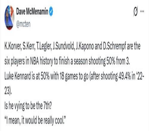 另外,NBA歷史上目前只有6位曾經(jīng)單賽季三分命中率達到至少50%的球員。他們是科沃爾、科爾、萊格勒、桑德沃爾德、卡波諾、施拉姆夫??霞{德目前三分命中率50%,本賽季還剩18場比賽(他2022?23賽季命中率為 49.4%)。他會成為歷史第 7 人嗎?