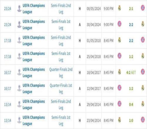 克羅斯效力皇馬時(shí)期對(duì)陣拜仁戰(zhàn)績
