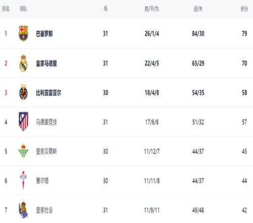 在積分榜上,巴薩遙遙領先。巴薩26勝1平4負,拿到79分。而皇馬被遠遠甩開。皇馬只拿到70分,落后了9分,爭冠希望極其渺茫。比利亞雷亞爾以58分排名第3。輸球的馬競總積分依然是57分,排名第4?;始邑惖偎?5分排名第5。第6的是塞爾塔,拿到44分。皇家社會以42分排名第7。赫塔費41分排名第8。