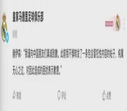 直到壓力無(wú)法回避,皇馬終于“行動(dòng)”了。2月22日晚,皇馬官方微博發(fā)布了一則赫伊森的“道歉聲明”,全文中文,核心意涵只有四個(gè)字:“無(wú)心之過”。