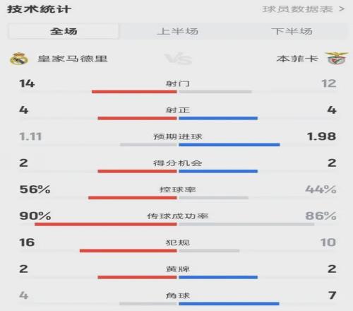 全場(chǎng)比賽,本菲卡的預(yù)期進(jìn)球(xG)高達(dá)1.98,而皇馬只有1.11。本菲卡創(chuàng)造了更多的絕佳機(jī)會(huì),射門(mén)數(shù)12-14并不落下風(fēng),甚至在第60分鐘由拉法·席爾瓦完成了一腳擊中橫梁的射門(mén)——如果這球進(jìn)了,皇馬大概率已經(jīng)回家釣魚(yú)了。