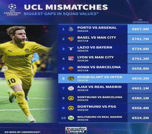 賽后數(shù)據(jù)刺眼得讓人心寒:國米全隊身價4.1億歐元,首發(fā)總身價更是高達數(shù)億,而博德閃耀全隊身價僅4260萬歐元。兩隊身價差高達6.1億歐元,這在歐冠歷史上足以排進“以弱勝強”的前十名。