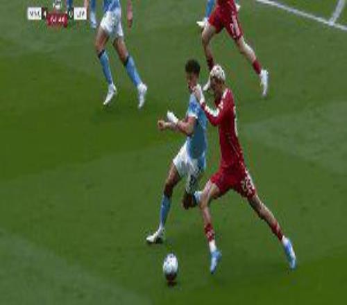 第39分鐘,范戴克禁區(qū)內(nèi)放倒奧賴?yán)?,主裁判罰點(diǎn)球。哈蘭德主罰命中,曼城1比0領(lǐng)先。